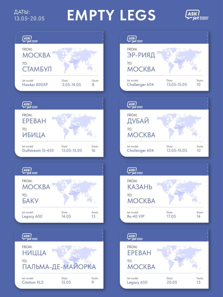 Для получения полного списка Empty Legs напишите или позвоните нам