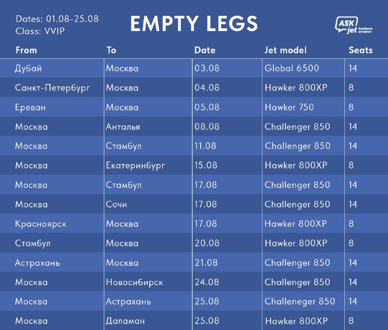 Полный список актуальных Empty Legs, которые обновляются онлайн каждый день, вы можете посмотреть на нашем сайте.
