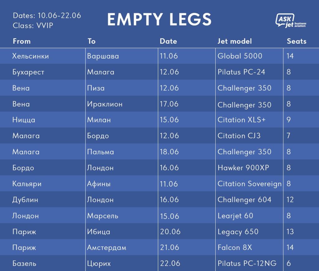 Для получения полного списка Empty Legs напишите или позвоните нам